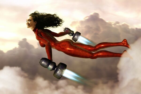 Voando no céu menina em um terno vermelho