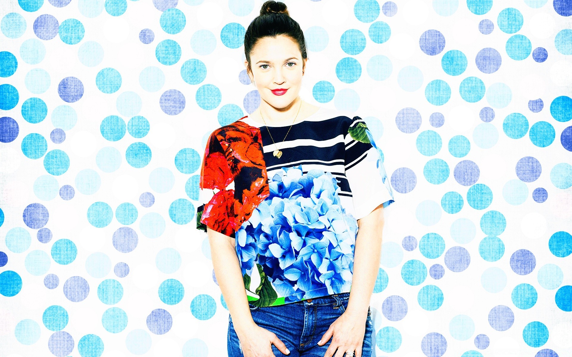 Mulher em uma blusa de diferentes impressões - papel de parede no telefone