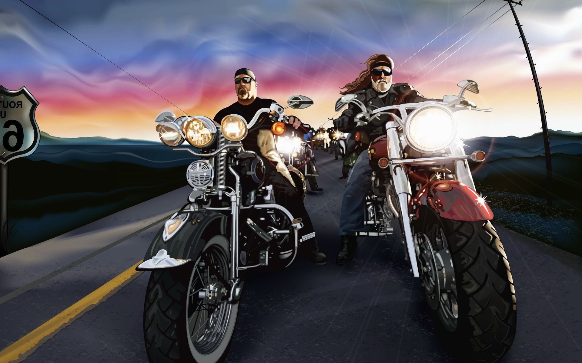 Homens em motocicletas na estrada. Belo pôr do sol - papéis de parede