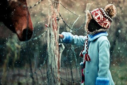 Menina alimenta um belo cavalo