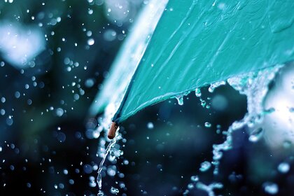 Chuva escorre do guarda-chuva azul da noite