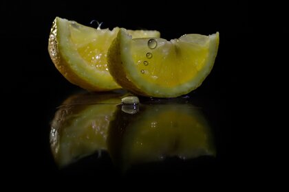 Pedaços de limão na mesa com salpicos de suco
