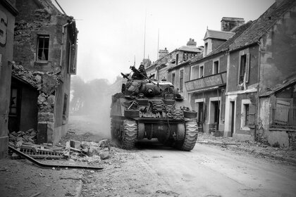Um tanque militar em uma rua da cidade destruída