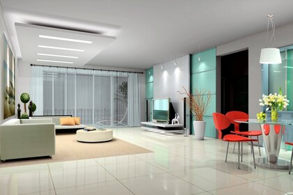 Quarto espaçoso com decoração luminosa