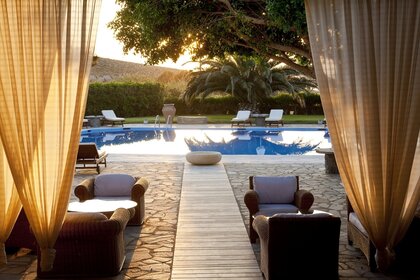 Vista noturna do hotel para a piscina