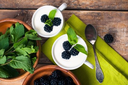 Amoras e folhas de hortelã em canecas