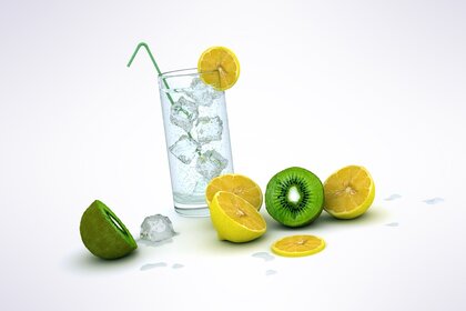 Água com limão e gelo em um copo alto