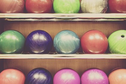 Bolas de boliche coloridas colocadas nas prateleiras