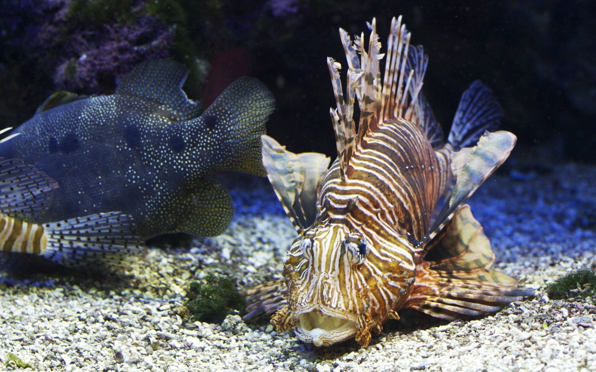 Na água, muitas folhas de nenúfares e peixes nadam nas proximidades