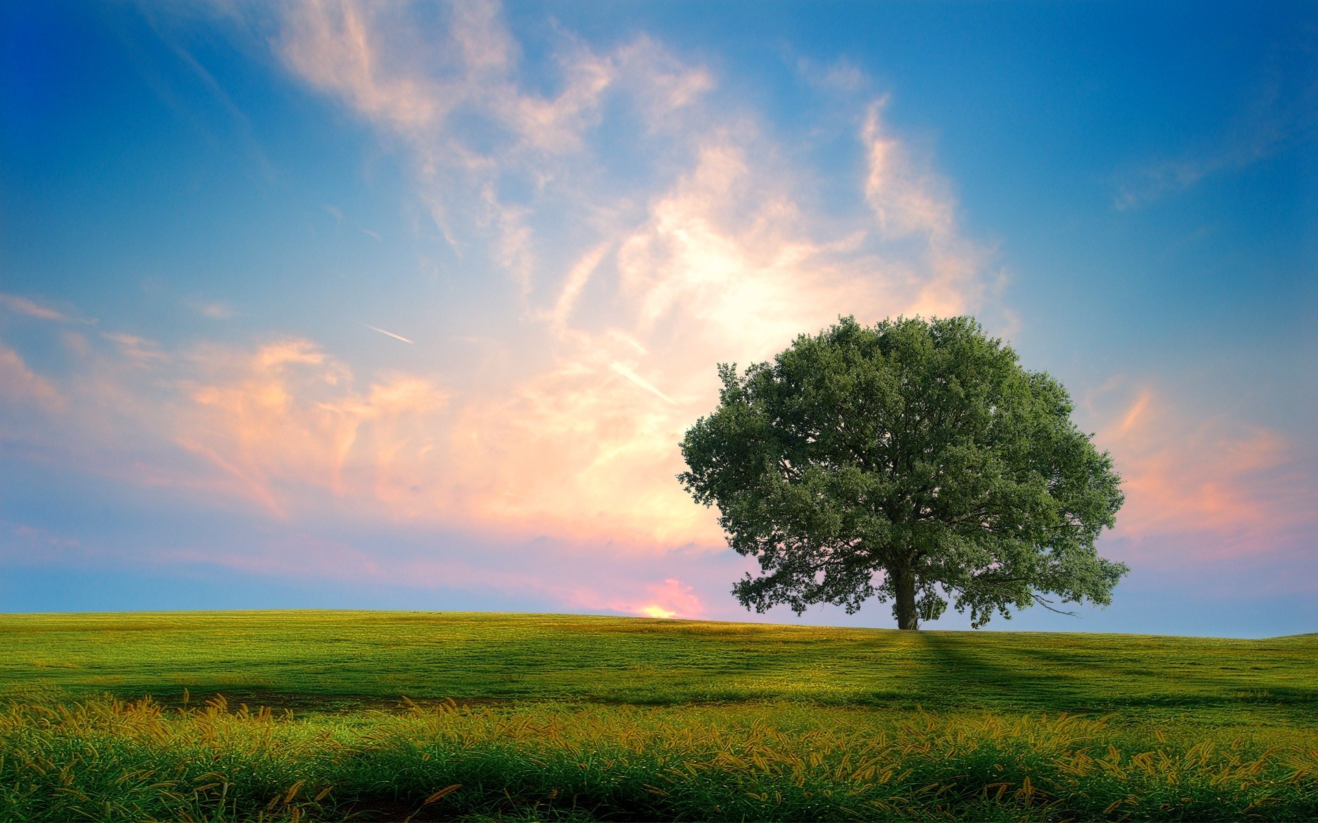 Bela paisagem. Belo céu. Árvore. Erva