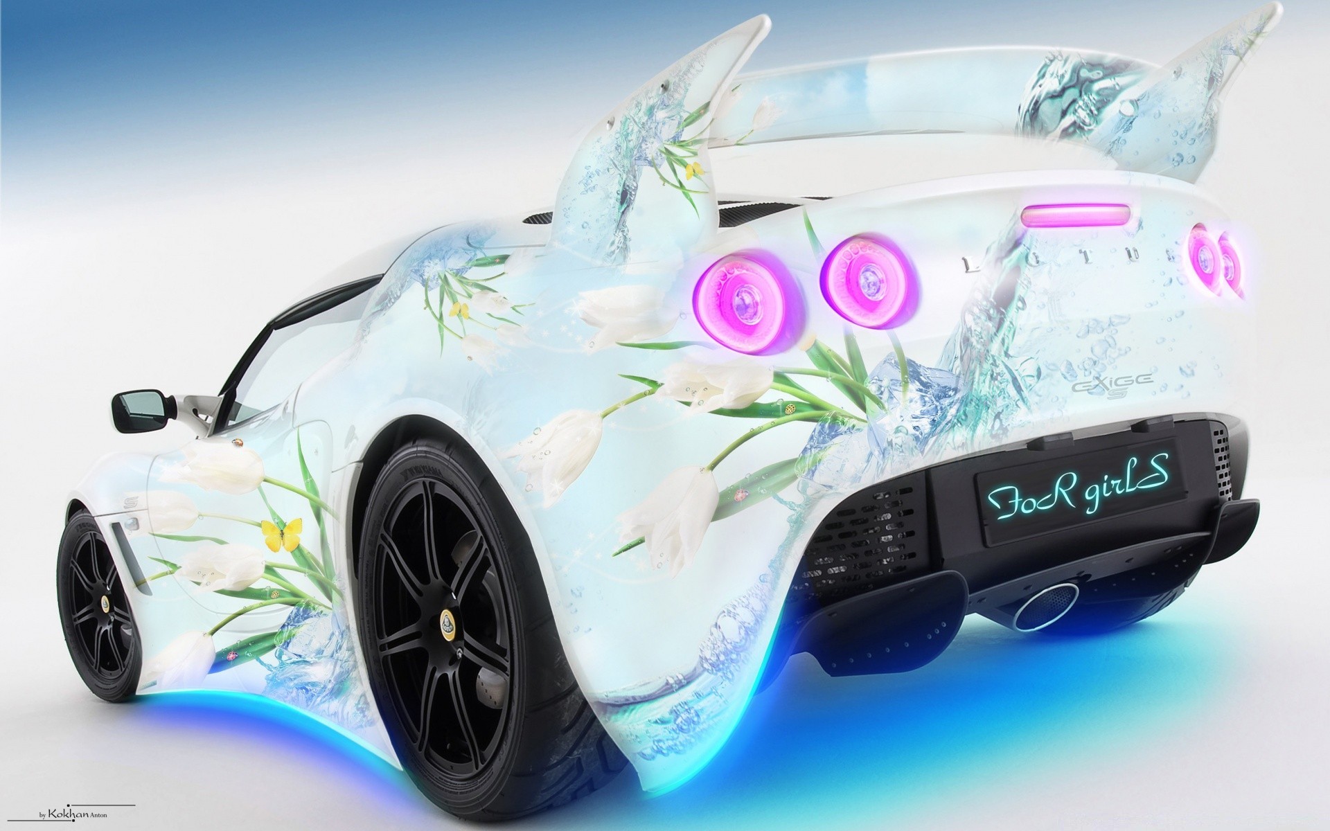 Carro esportivo branco com cores e luz de fundo azul de néon