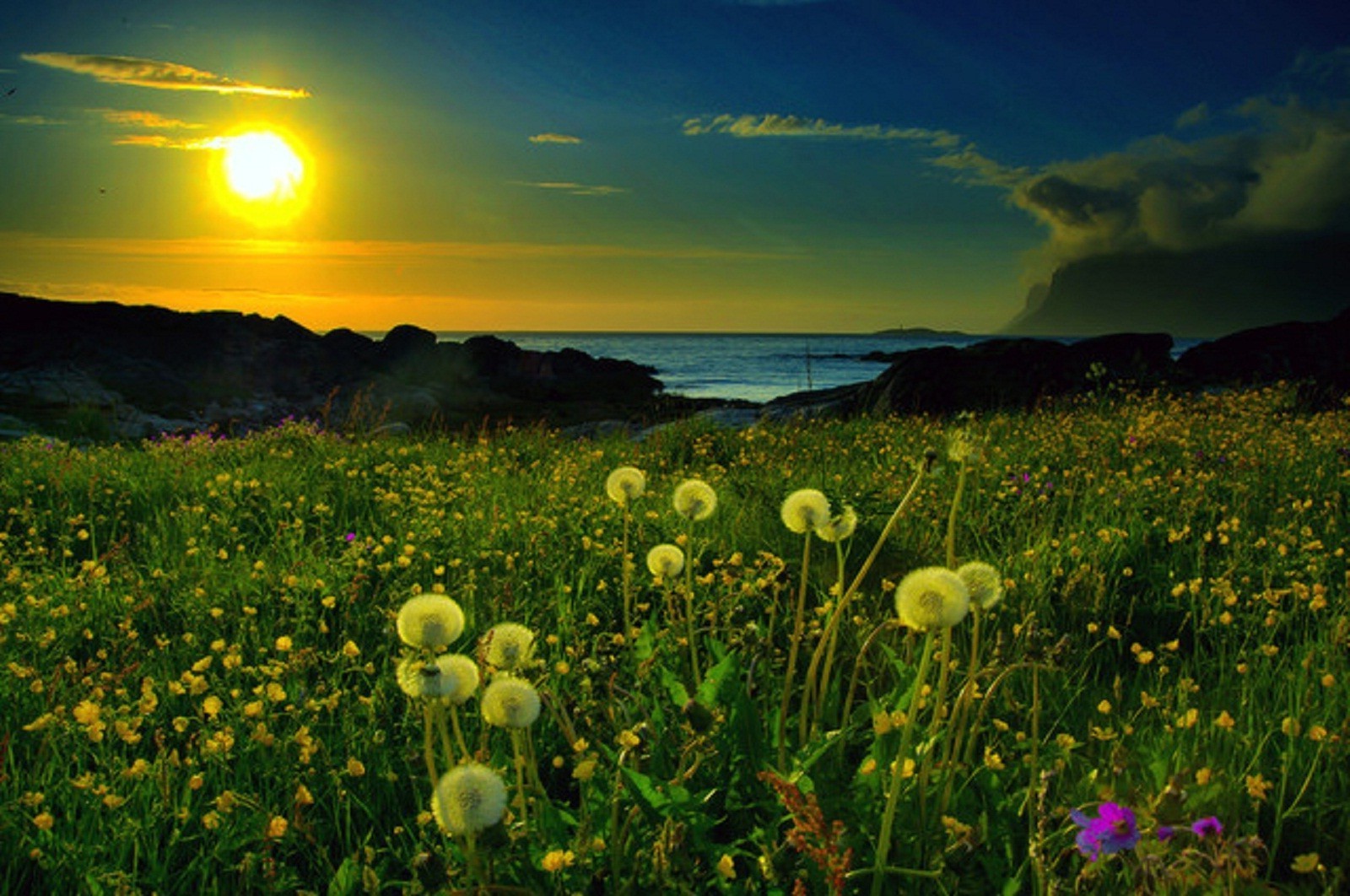 Amanhecer em uma clareira entre dentes-de-leão à beira-mar