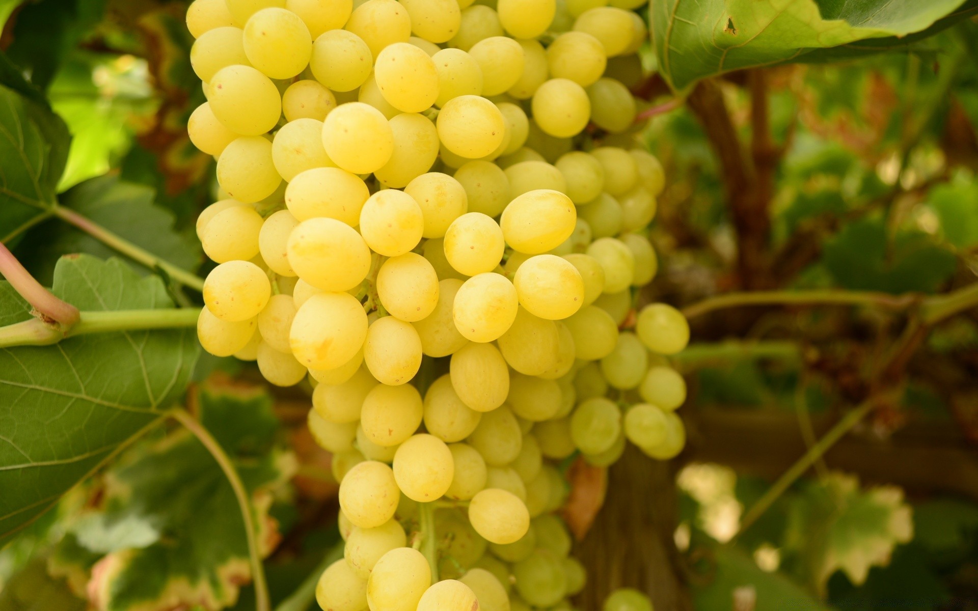 Um enorme cacho de uvas amarelas com folhagem verde. Uvas ensolaradas