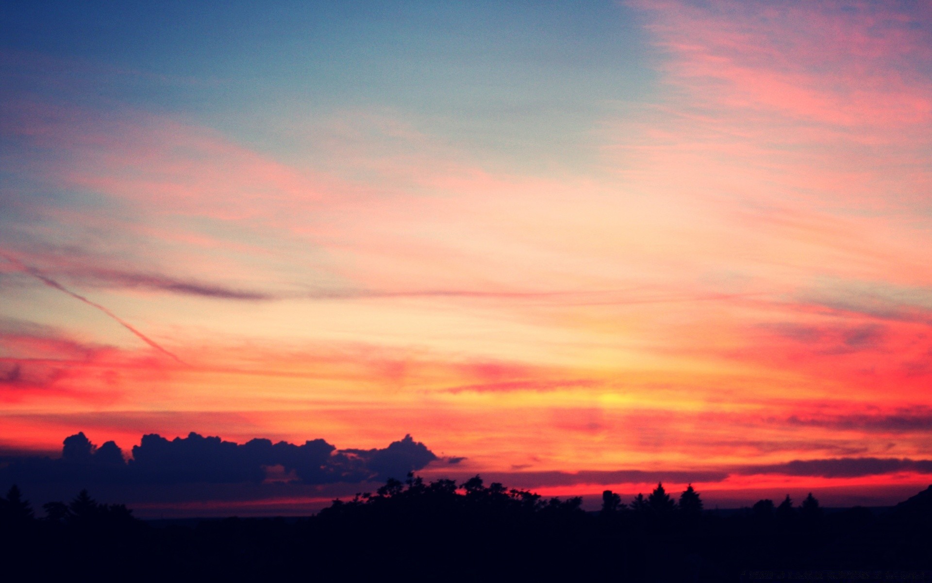 Paisagem com céu cintilante e montanhas ao pôr do sol