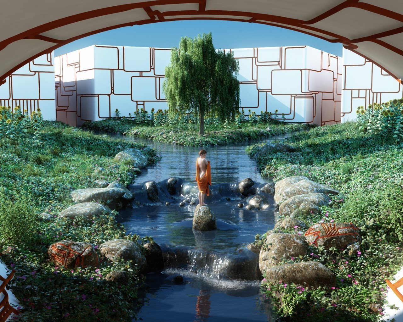 Menina K fica em uma pedra em um lago artificial no jardim sob o arco