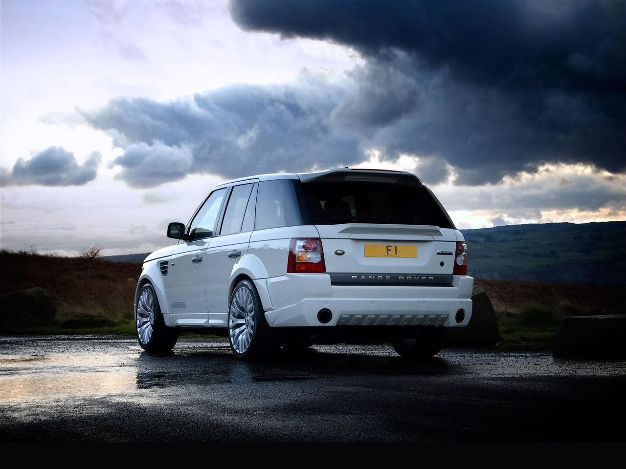 Range rover em asfalto molhado em meio a uma nuvem