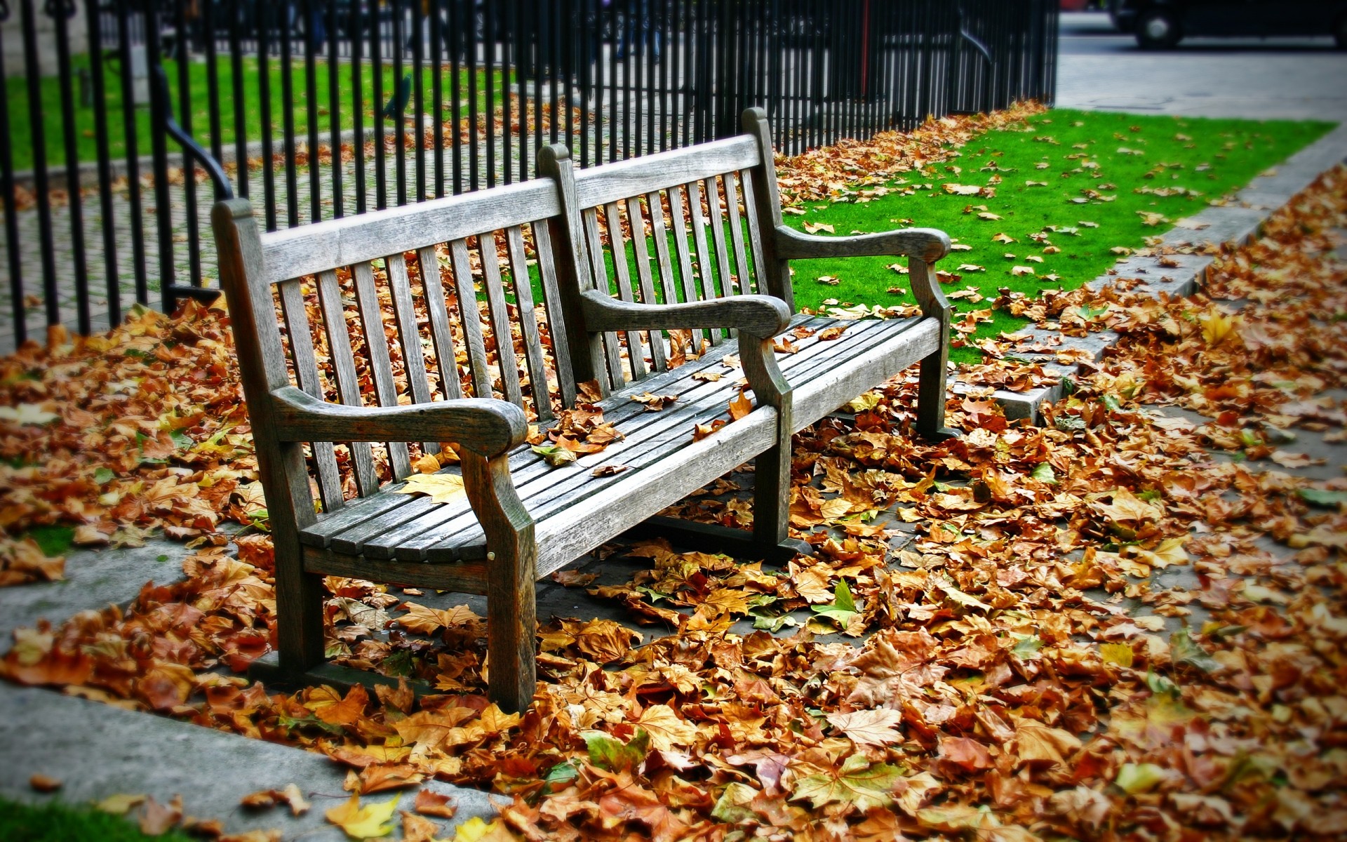 Banco de madeira fica na floresta do outono entre as folhas amarelas caídas