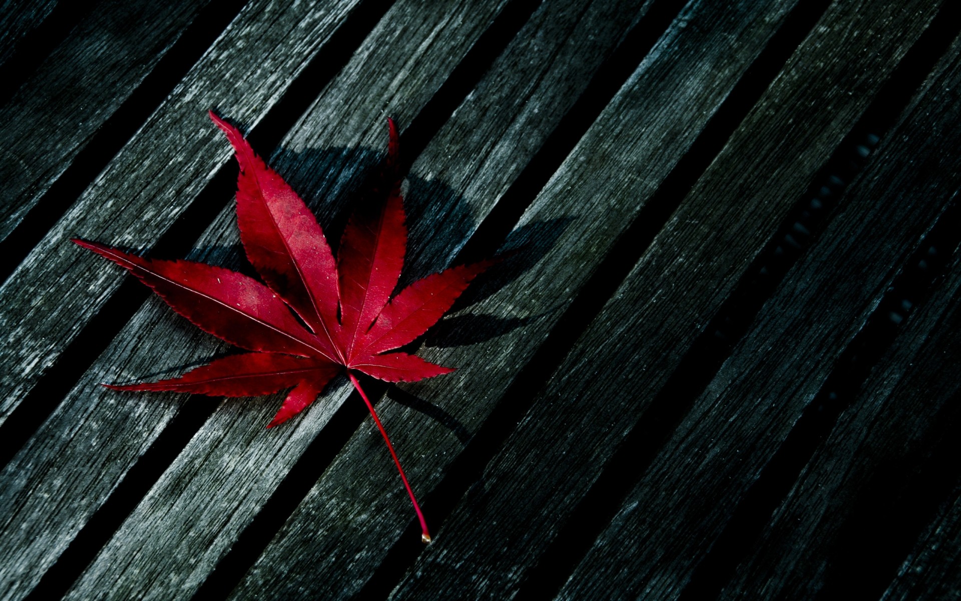 Folha vermelha no banco de madeira velho