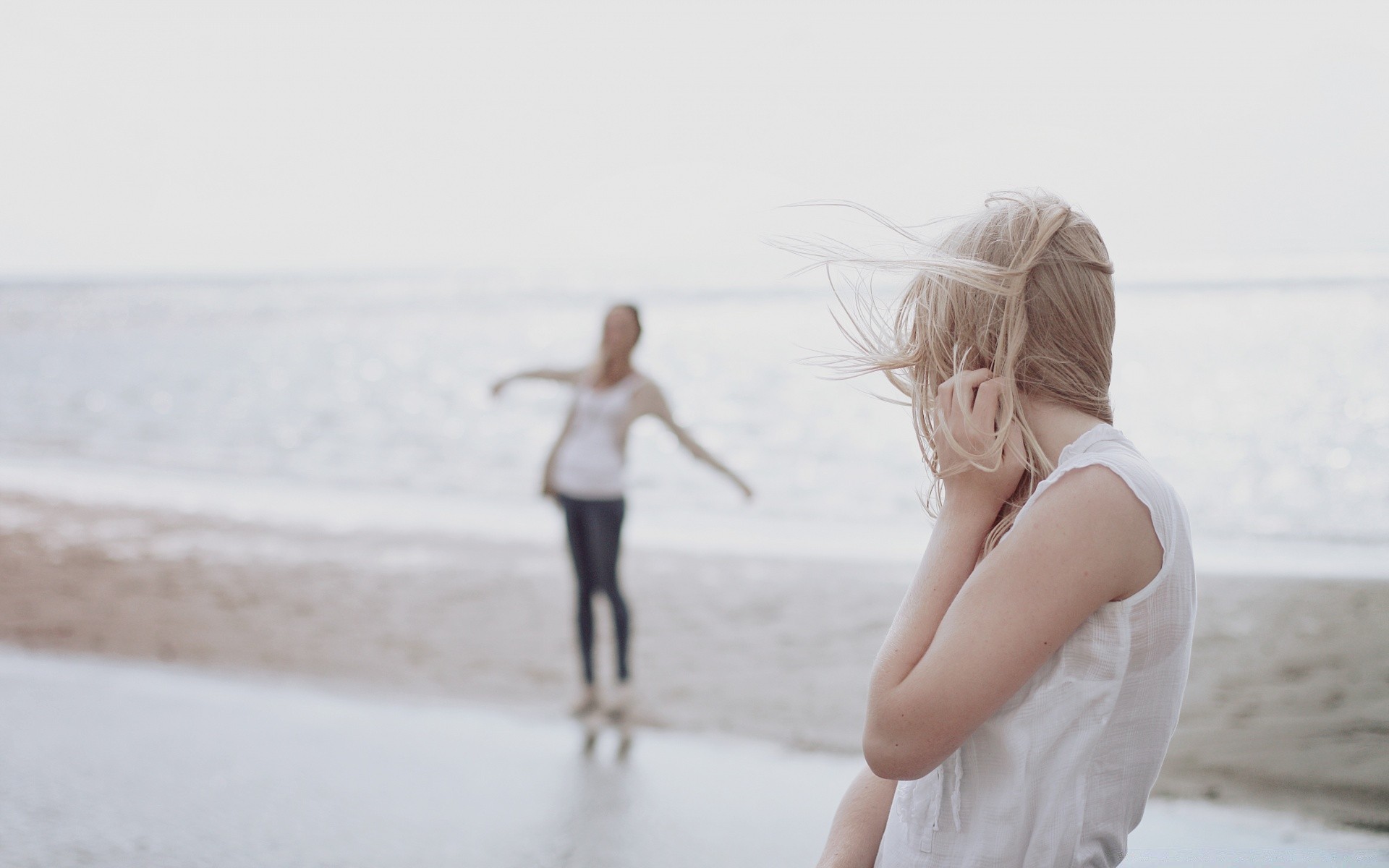 Duas meninas na praia à beira-mar
