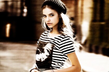 Menina em chapéu de lã e t-shirt listrada com impressão de modaMenina em chapéu de lã e t-shirt Listrada Com impressão de moda