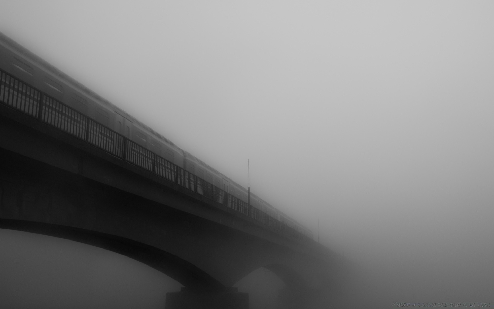 Trem na ponte saindo no nevoeiro