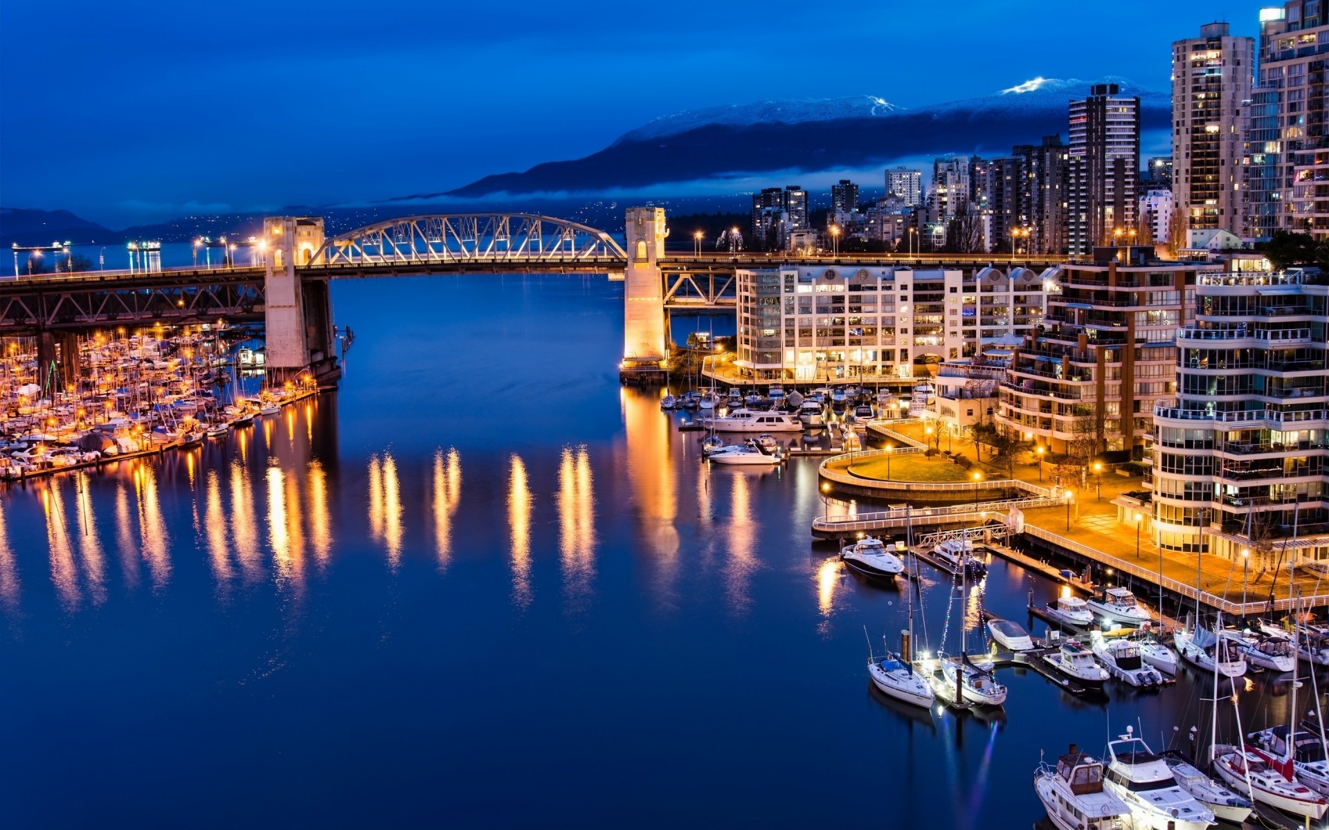 Uma ponte sobre o rio conectando partes da cidade noturna em luzes no fundo de uma montanha em uma névoa branca