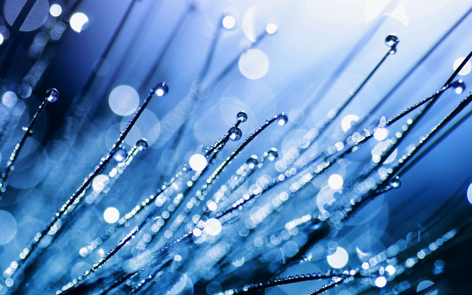 Fotografia macro de gotas de orvalho na grama depois da chuva em tons de azulFotografia Macro de gotas de orvalho na grama depois da chuva em tons de azul