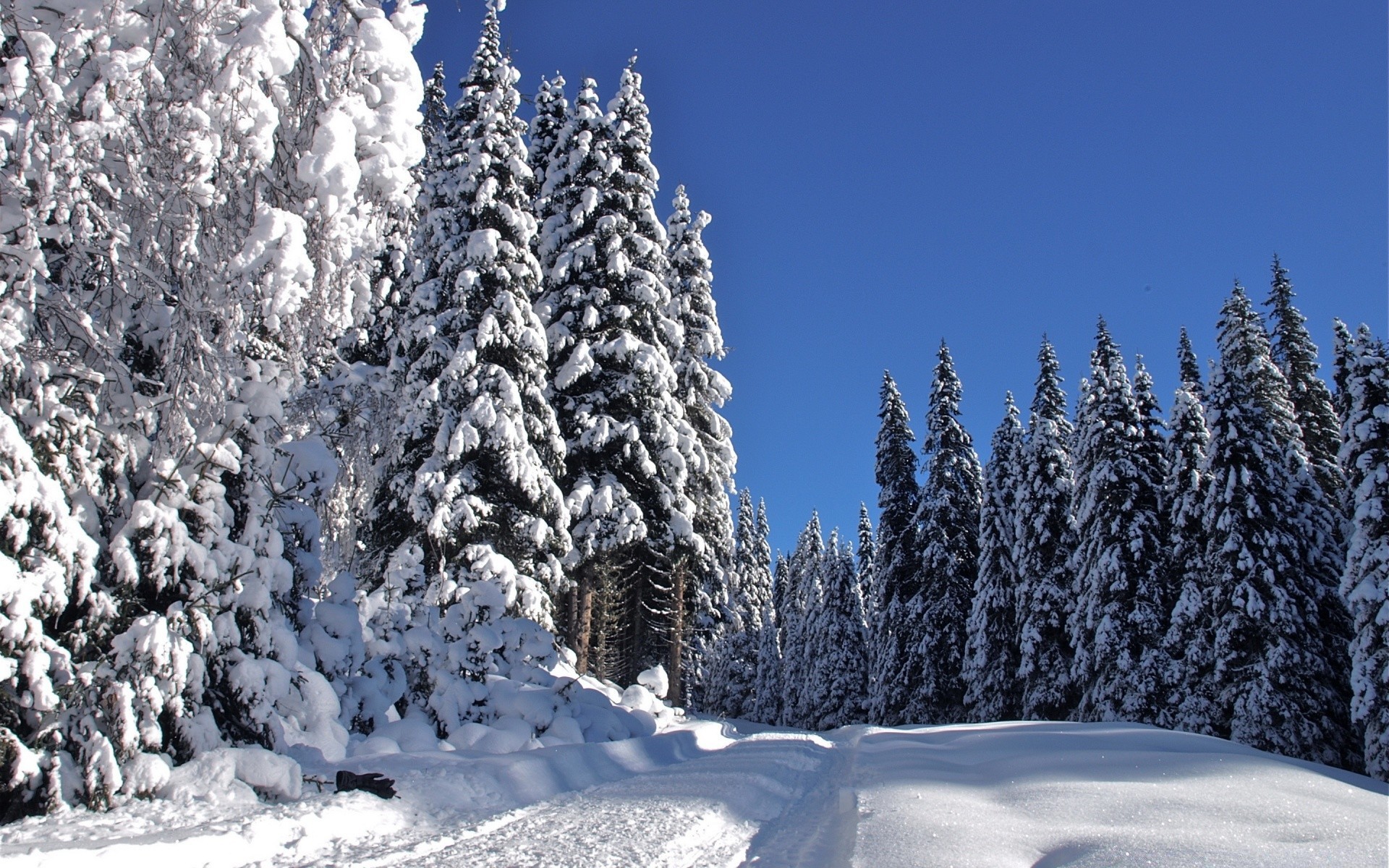 Um caminho entre montes de neve em uma floresta coberta de neve