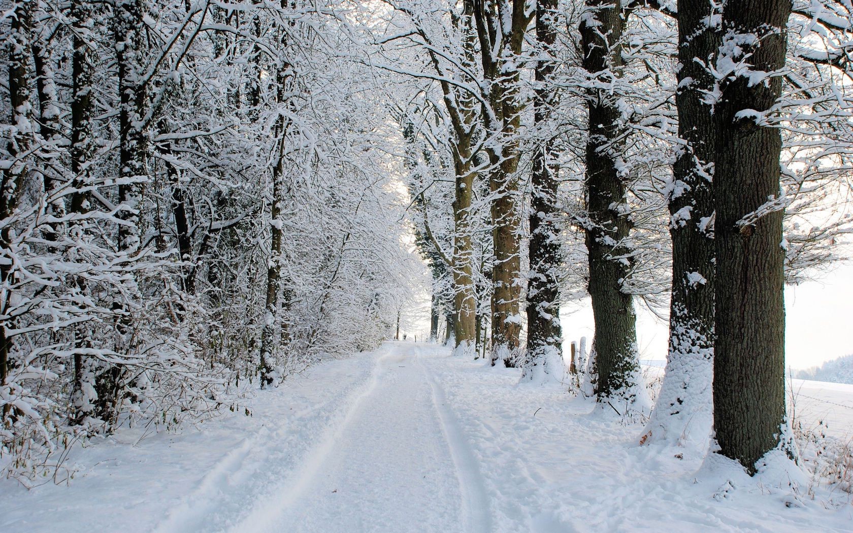 Árvores brancas cobertas de neve ao longo de um rio congeladoÁrvores brancas cobertas de neve ao longo de um rio congelado