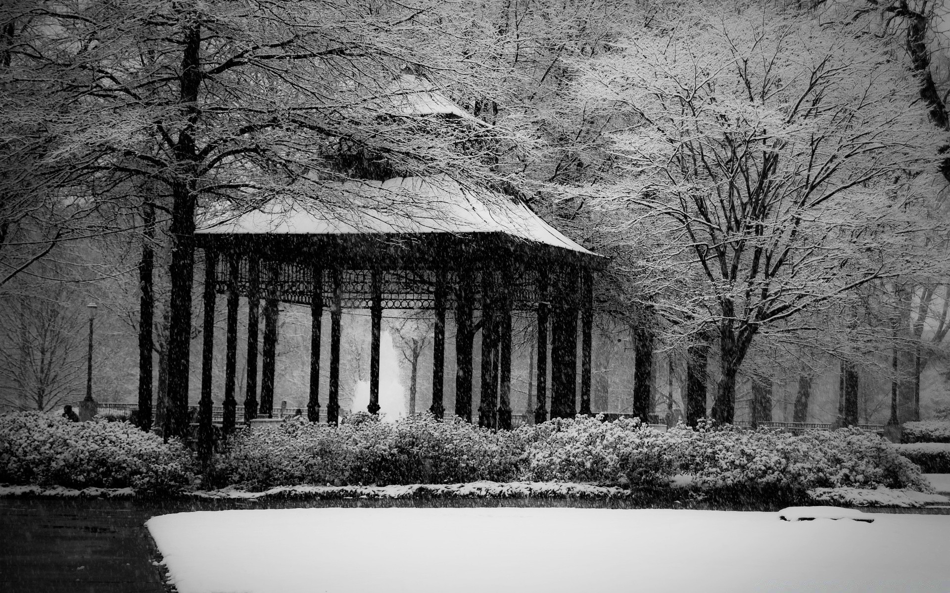 Um caramanchão sombrio em um parque de neve
