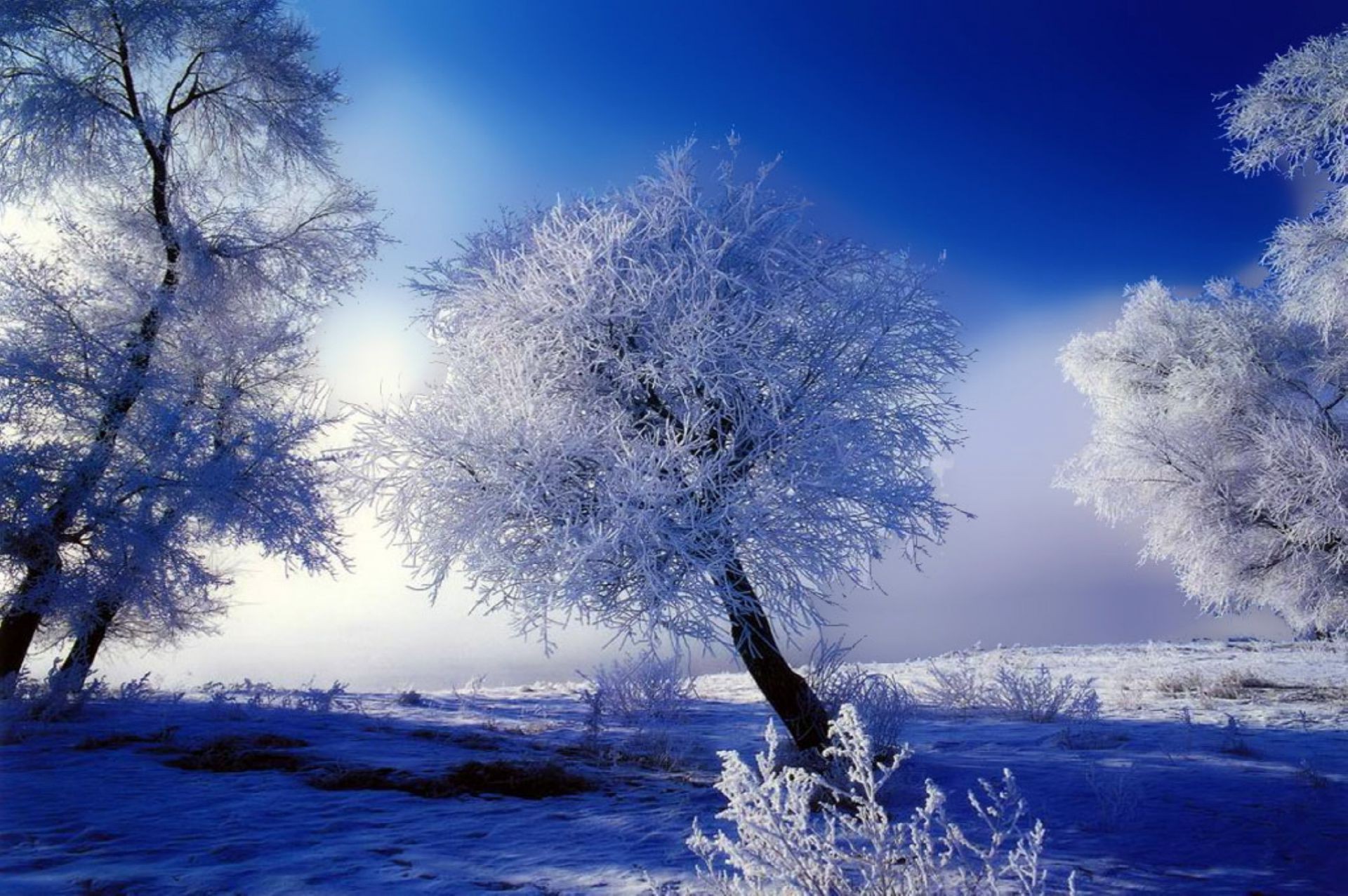 Árvores centenárias cobertas de neve no fundo das montanhas