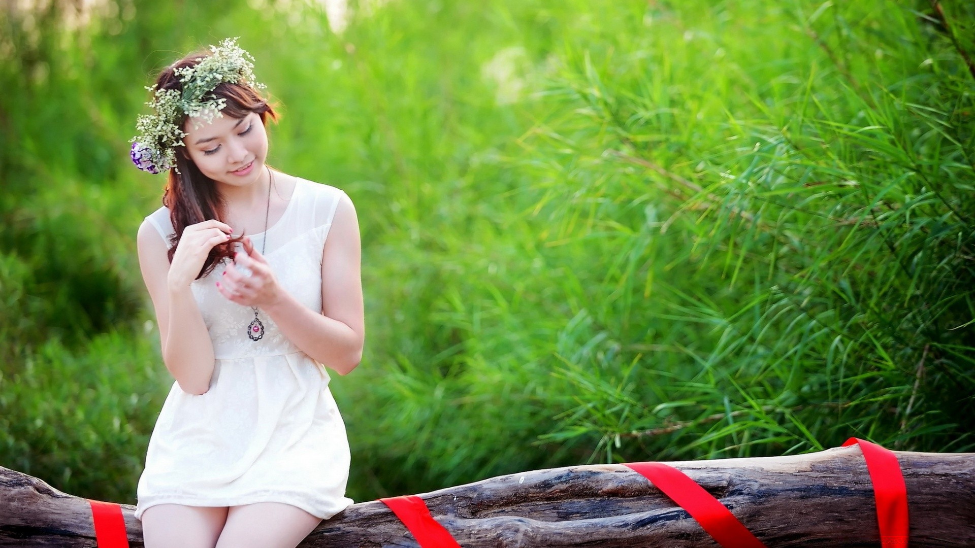 Menina bonita com uma grinalda na cabeça na natureza
