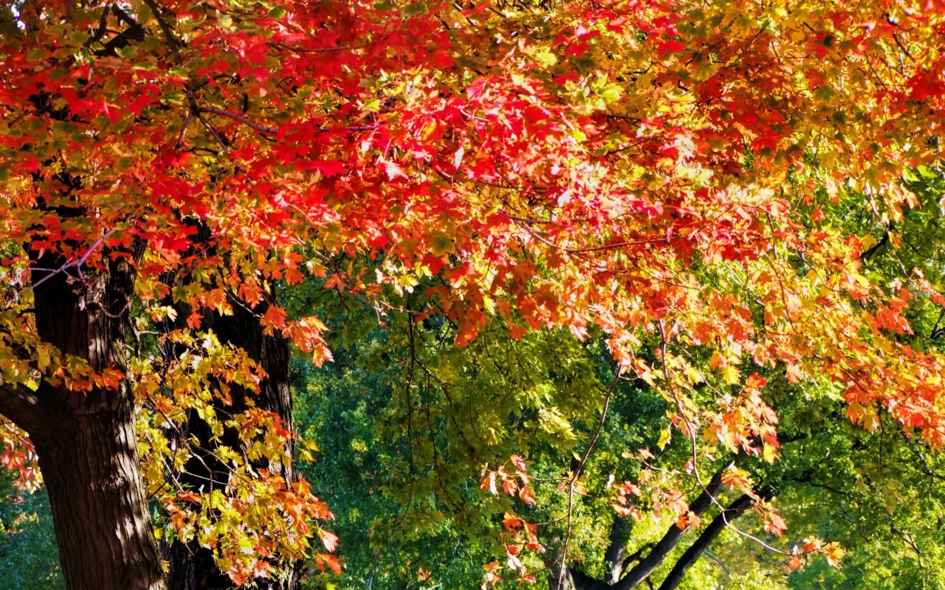Cores do outono. Floresta do outono. Folhagem brilhante. Árvores no outono