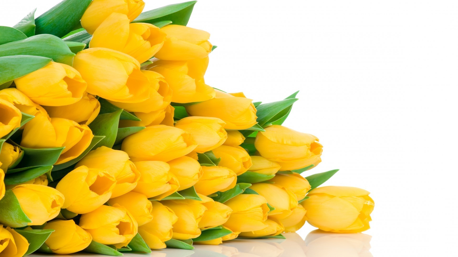 Um grande buquê de tulipas amarelas fica na superfície sobre um fundo branco