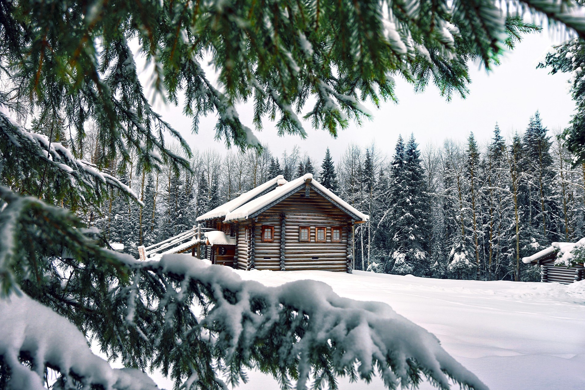 Cabana de madeira entre a floresta de abeto coberta de neve