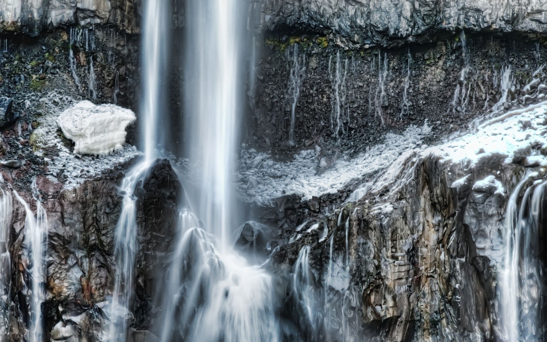 Pedras marrons entre uma cachoeira em um fundo desfocado
