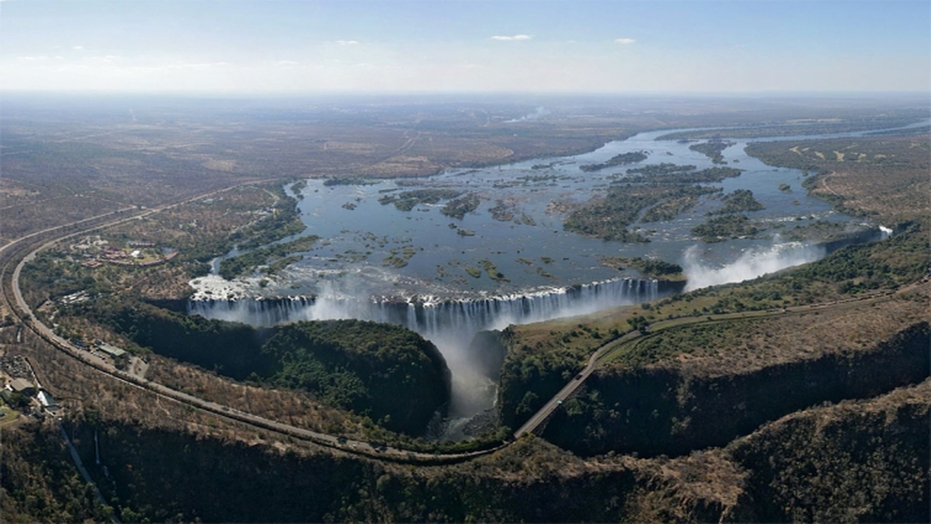 Uma bela paisagem com cachoeiras e montanhas ao amanhecer