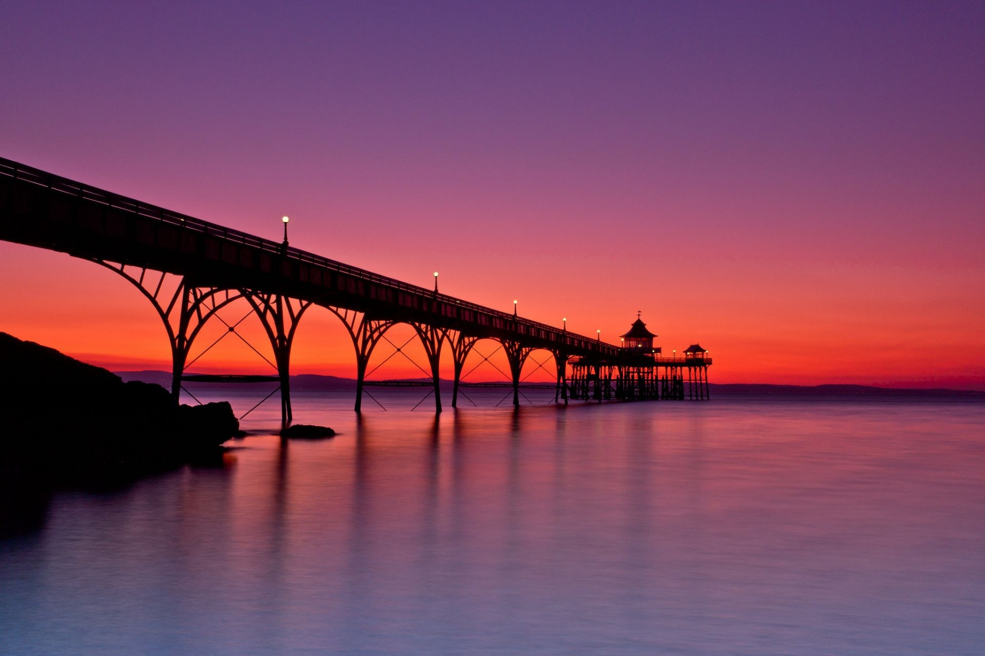 Ponte iluminada por Fanares sobre a água do mar