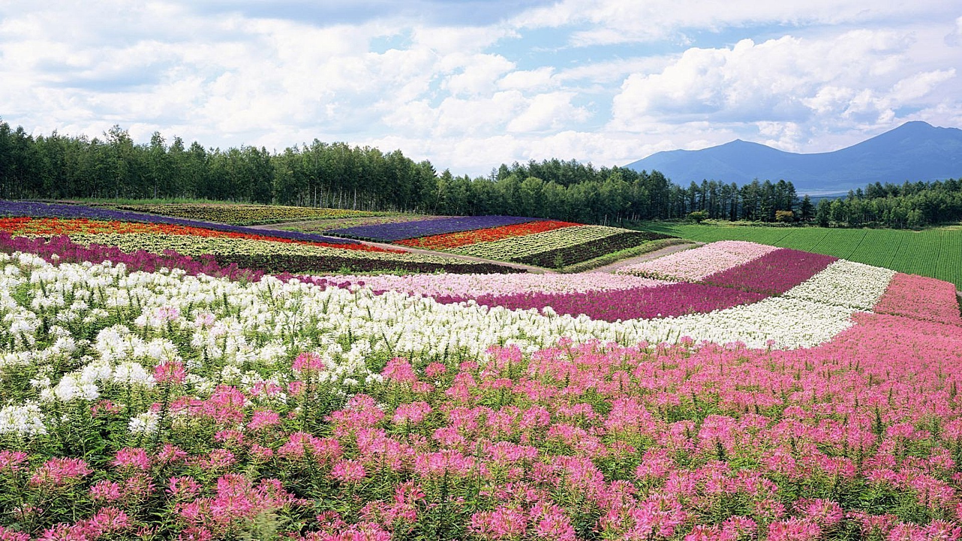 Campos multicoloridos de flores. Paisagem com montanhas e campos