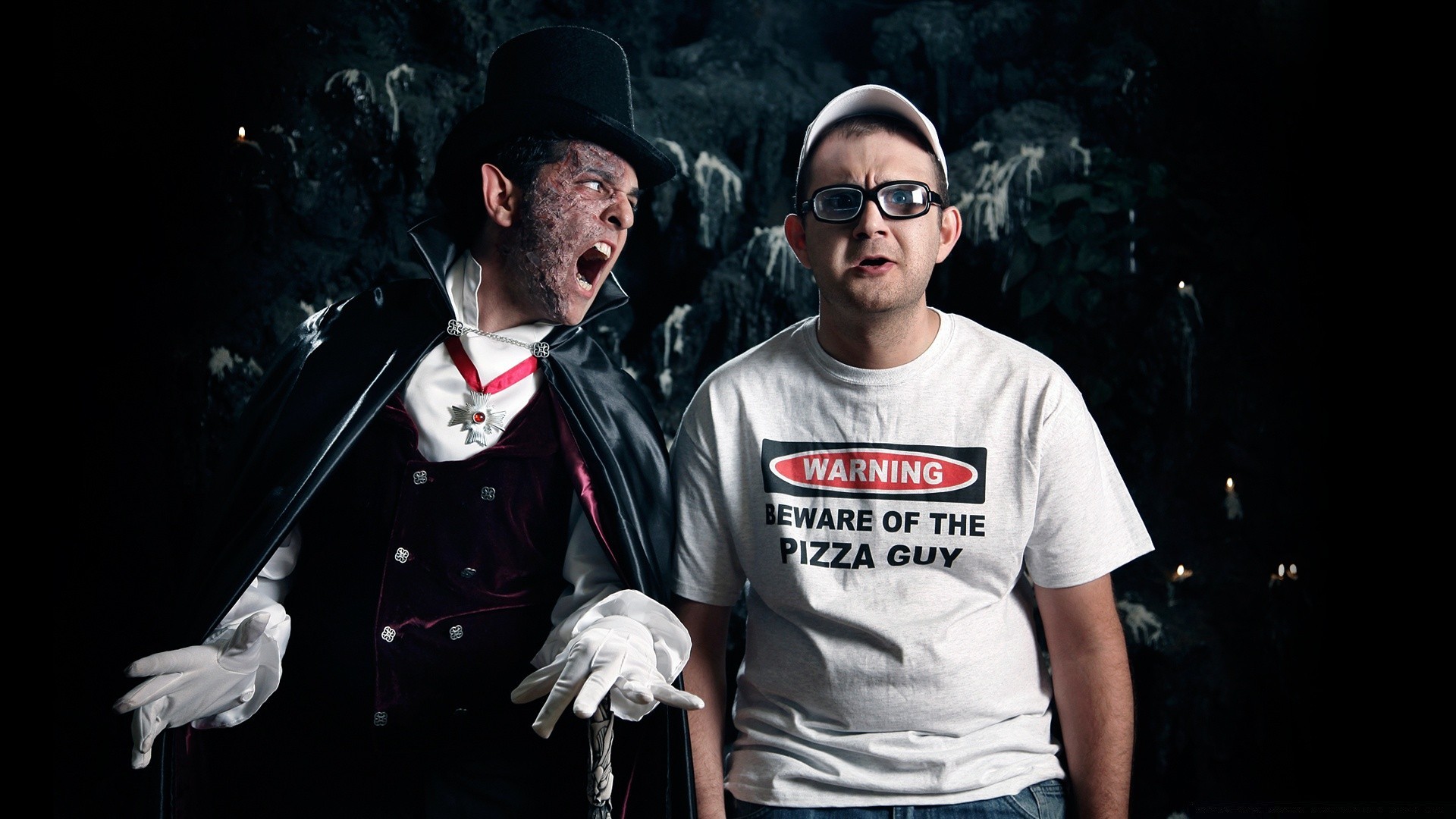 Dois homens sentados no chão em um quarto escuro