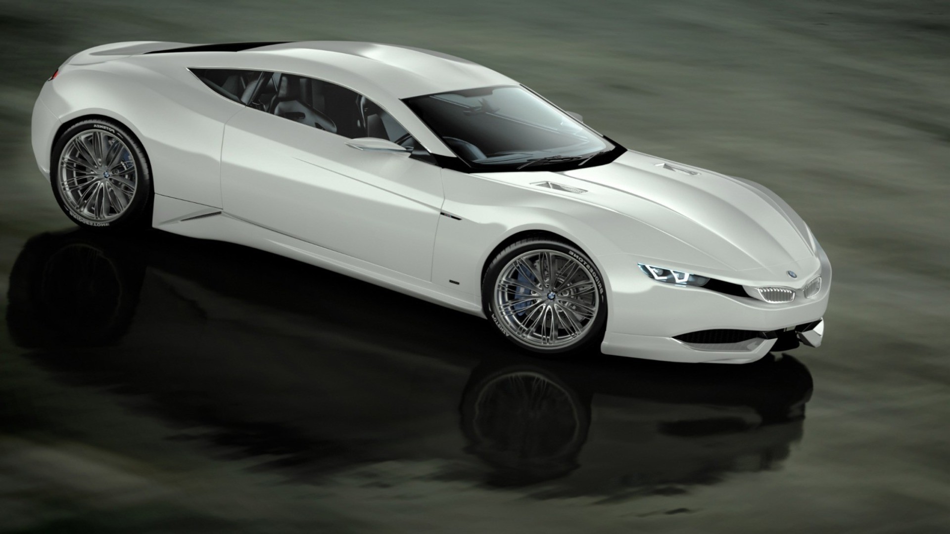 Carro esportivo branco na superfície do espelho pretoCarro esportivo branco na superfície do espelho preto