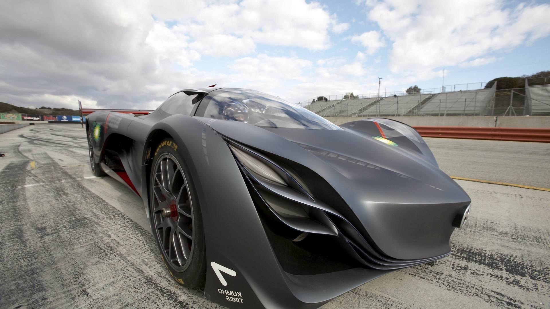 Carro desportivo preto fosco na pista. Disco. Roda