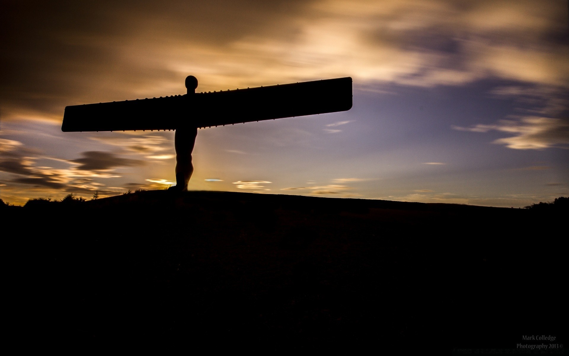 Pôr do sol, montanhas, céu, homem com uma prancha