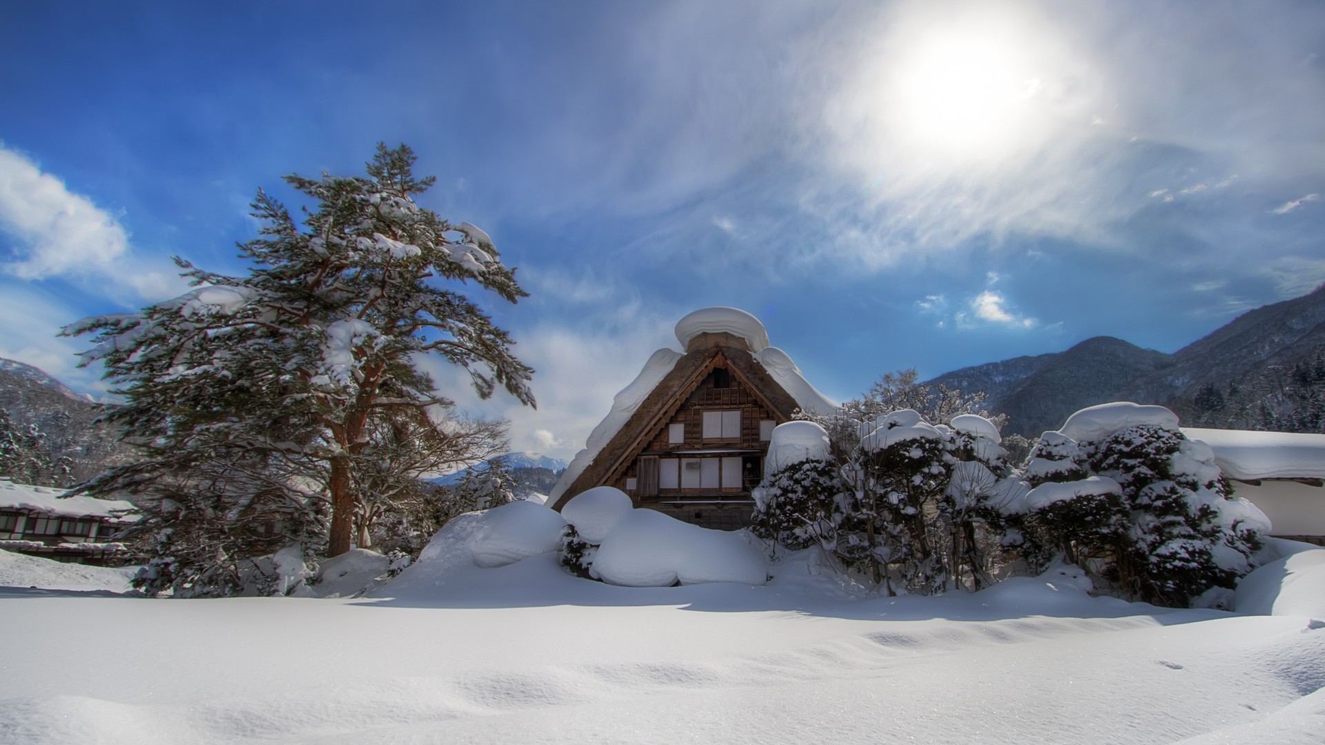 Antiga casa de pedra coberta de neve