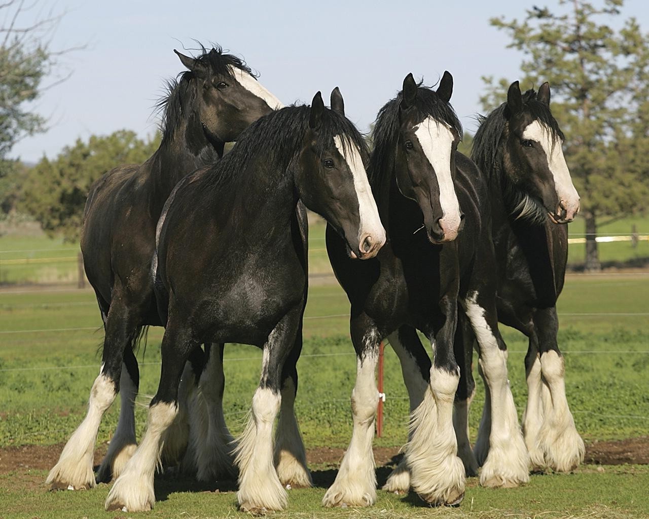 Cavalo cinzento contra o céu azul e a coroa das árvores