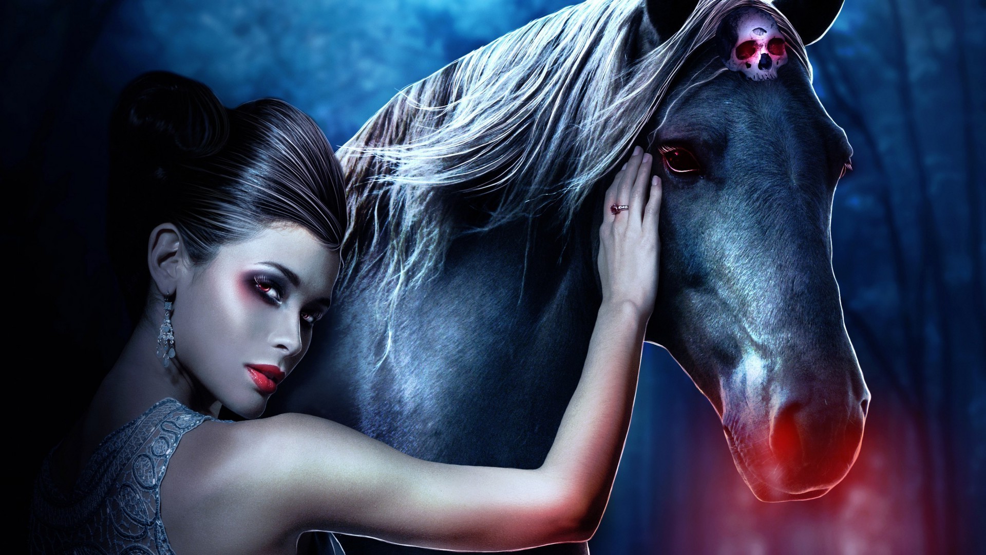 Mulher misteriosa com cavalo fantástico