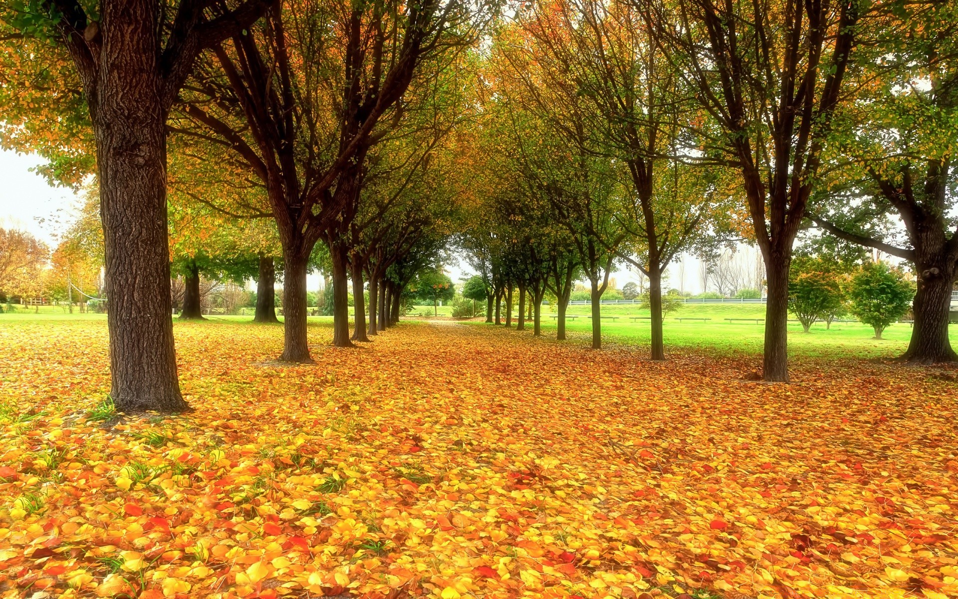 A estrada é coberta de folhas de outono