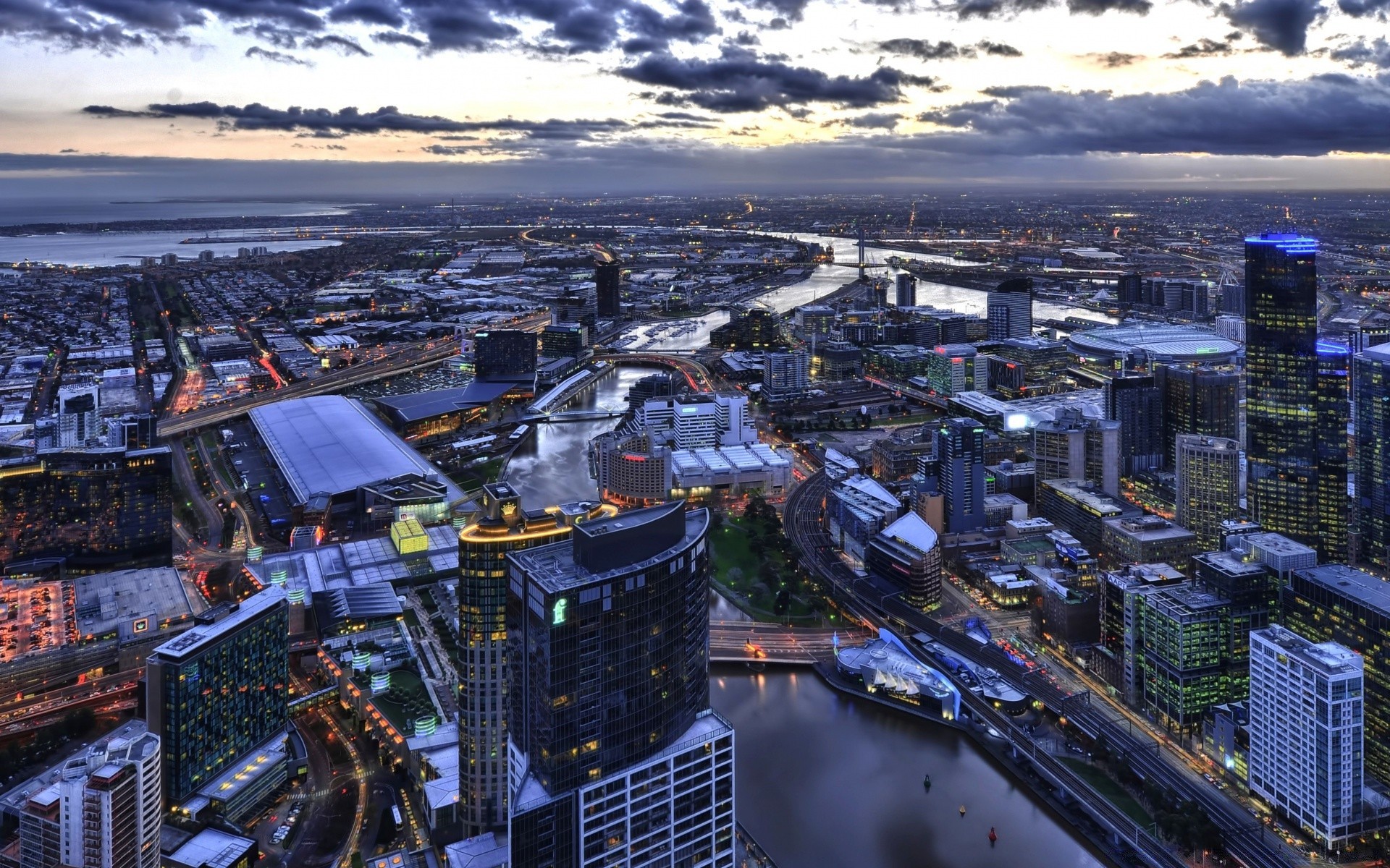 Pôr do sol no céu atrás de uma ponte no fundo da água em outra cidade