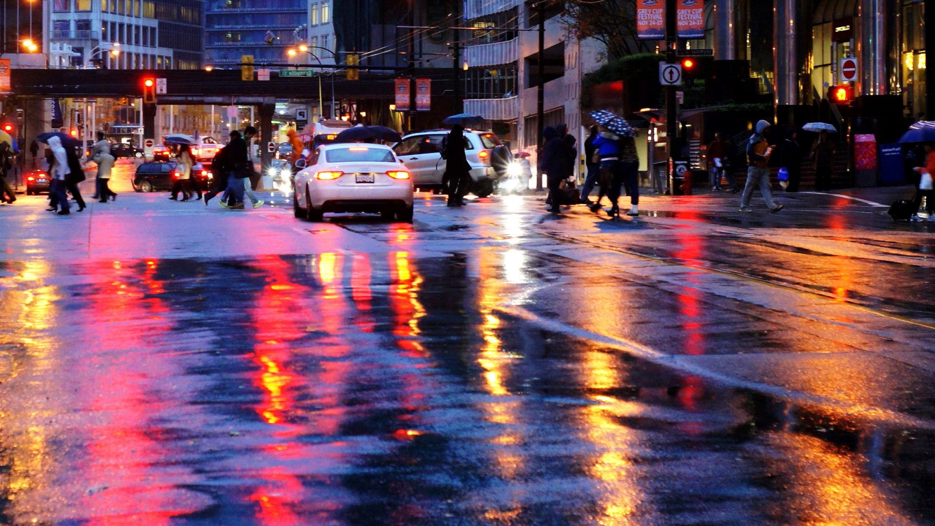 Relâmpagos sobre arranha-céus na cidade perto da ponte