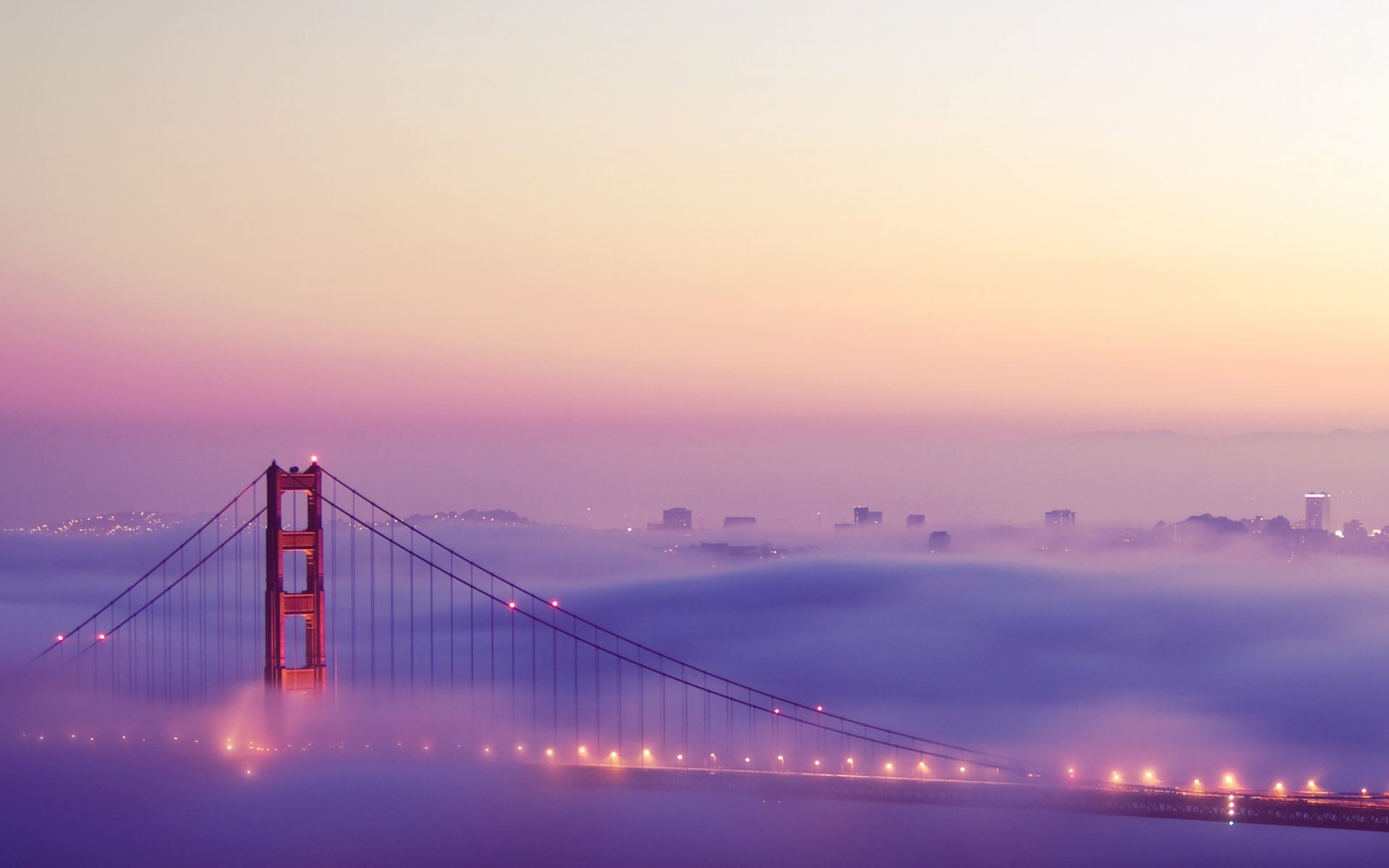 Ponte submersa em neblina espessa ao pôr do sol
